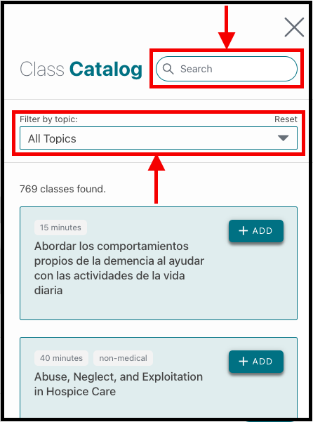 Step 2: Press the Filter by topic drop-down menu or search for the class you want to check. Look for your state abbreviation followed by CE. After selecting the topic filter, courses approved for continuing education credit in that state will be listed. You can add these classes to your curriculum using the steps found in this article.