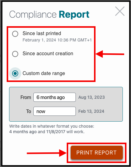 Once you have chosen a date range, please select the Print Report button.