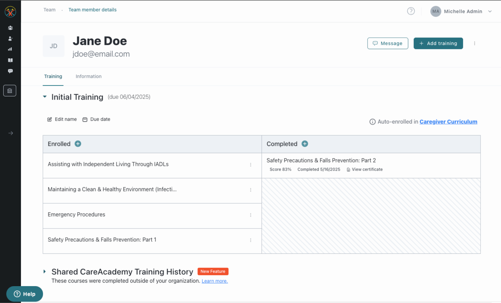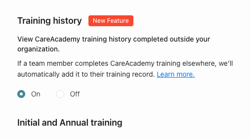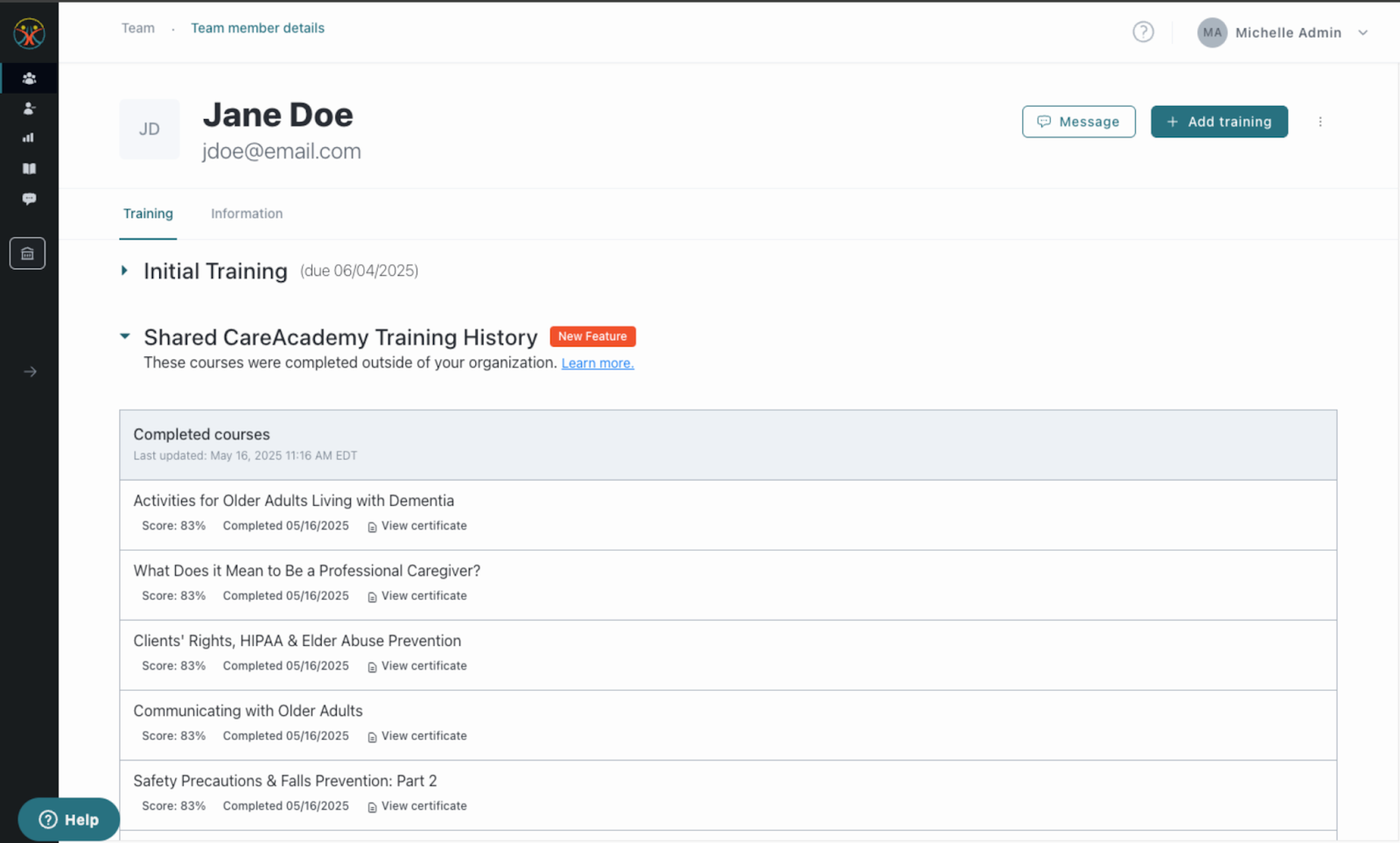 Shared Training History only supports completions done within CareAcademy. External training still requires manual certificate review.