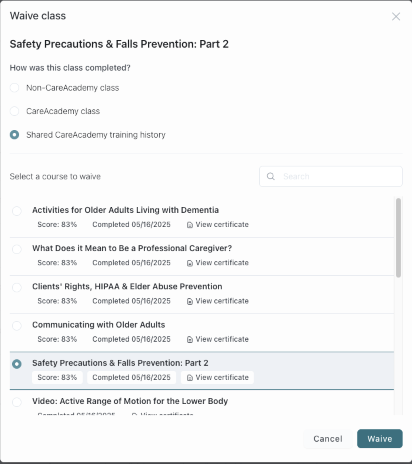 You cannot edit a shared CareAcademy training completion. Therefore, you cannot edit a course after it has been waived if you use a shared CareAcademy training completion. However, you can unwaive the course at any time.