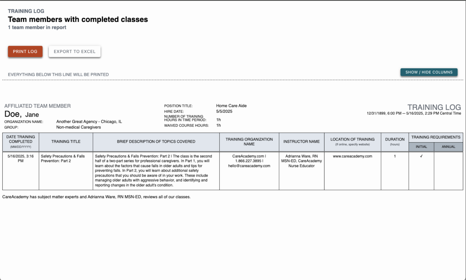 We retrieve the caregiver’s complete CareAcademy training history, as long as their identifying information (like name, email, and/or phone) matches across organizations.